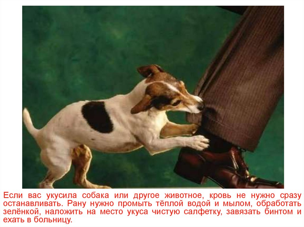 Если вас укусила собака или другое животное, кровь не нужно сразуостанавливать. Рану нужно промыть тёплой водой и мылом, обработать