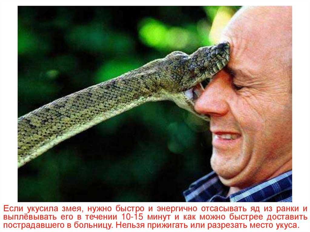 Если укусила змея, нужно быстро и энергично отсасывать яд из ранки ивыплёвывать его в течении 10-15 минут и как можно быстрее доставить