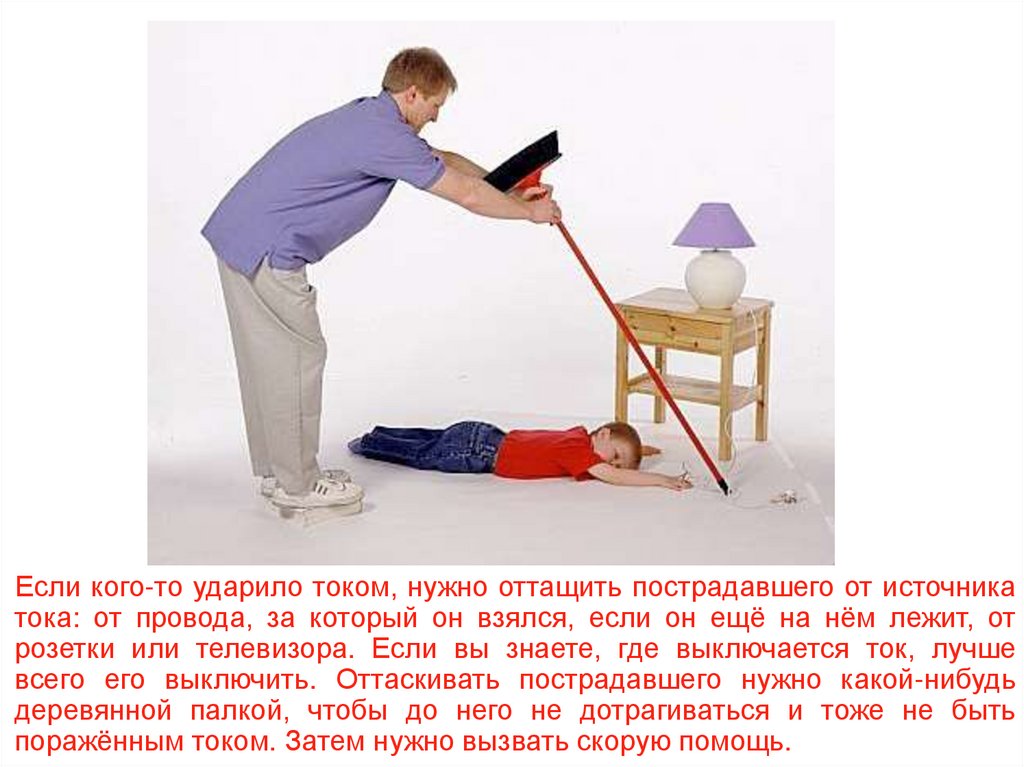 Если кого-то ударило током, нужно оттащить пострадавшего от источникатока: от провода, за который он взялся, если он ещё на нём лежит, от