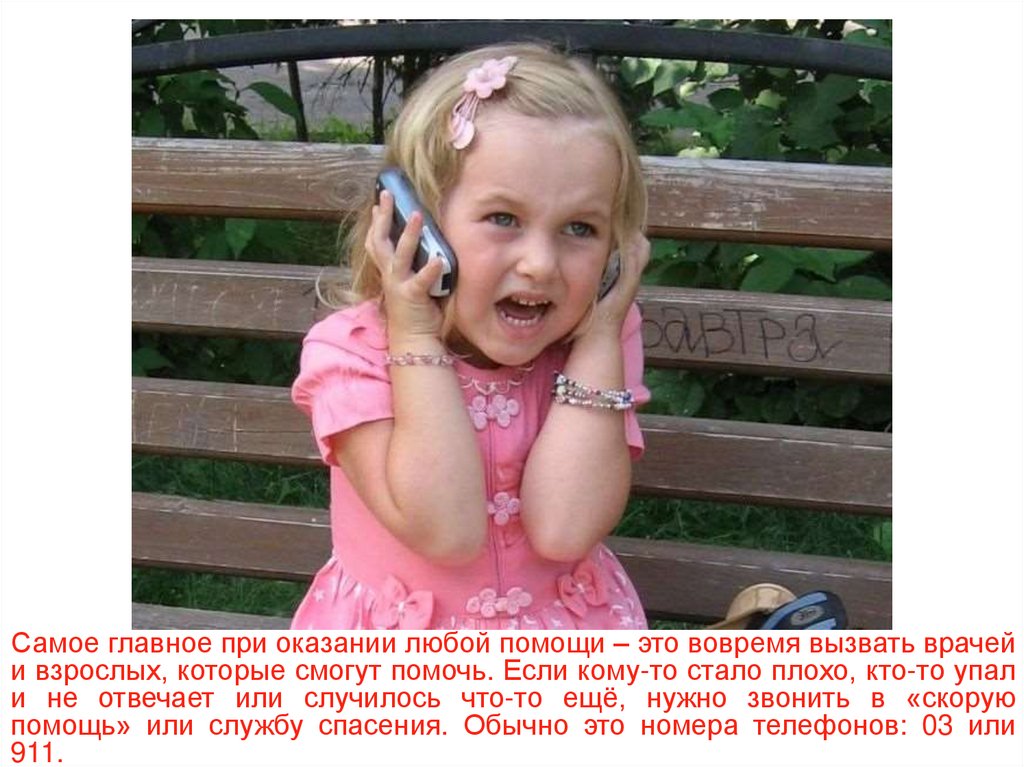 Самое главное при оказании любой помощи – это вовремя вызвать врачейи взрослых, которые смогут помочь. Если кому-то стало плохо, кто-то упал