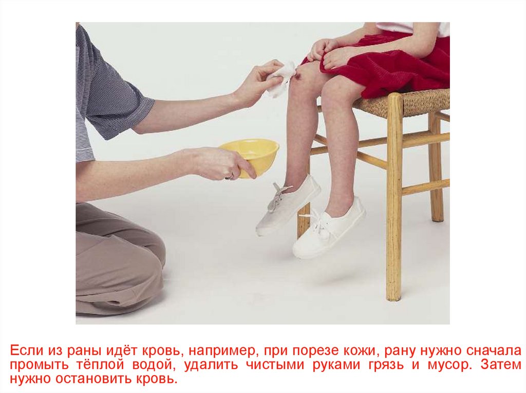 Если из раны идёт кровь, например, при порезе кожи, рану нужно сначалапромыть тёплой водой, удалить чистыми руками грязь и мусор. Затем