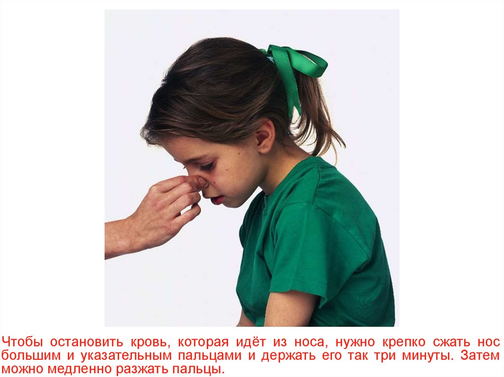 Чтобы остановить кровь, которая идёт из носа, нужно крепко сжать носбольшим и указательным пальцами и держать его так три минуты. Затем