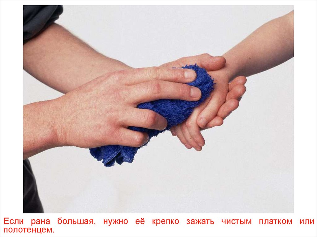 Если рана большая, нужно её крепко зажать чистым платком илиполотенцем.