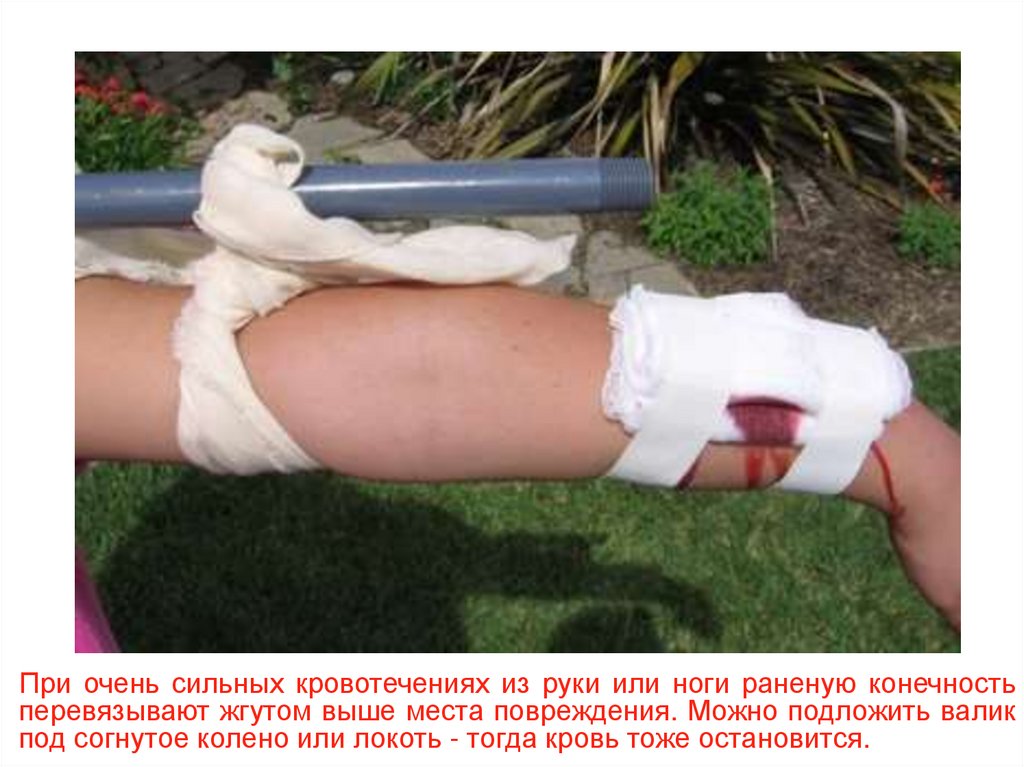При очень сильных кровотечениях из руки или ноги раненую конечностьперевязывают жгутом выше места повреждения. Можно подложить валик