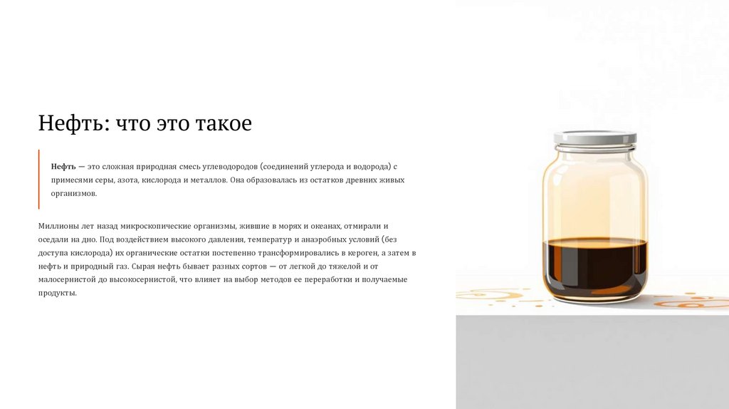 Нефть: что это такоеНефть — это сложная природная смесь углеводородов (соединений углерода и водорода) с