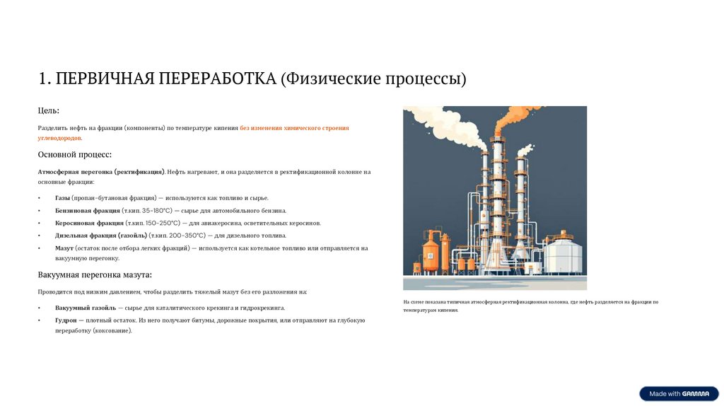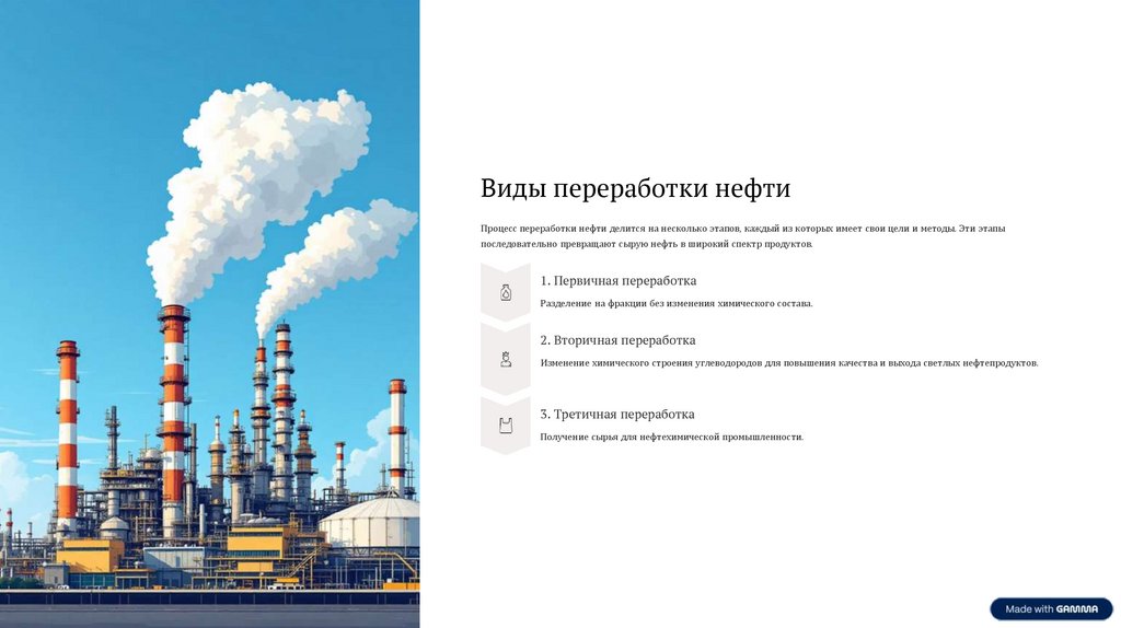 Виды переработки нефтиПроцесс переработки нефти делится на несколько этапов, каждый из которых имеет свои цели и методы. Эти этапы