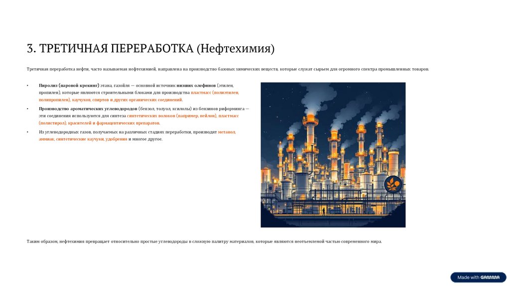 3. ТРЕТИЧНАЯ ПЕРЕРАБОТКА (Нефтехимия)Третичная переработка нефти, часто называемая нефтехимией, направлена на производство базовых химических веществ, которые служат сырьем для огромного спектра промышленных товаров.