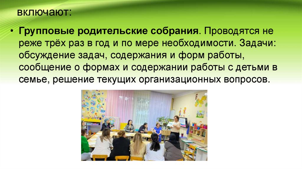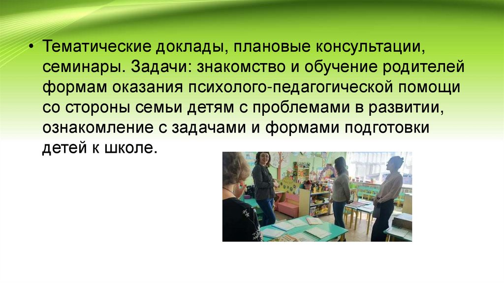 • Тематические доклады, плановые консультации,семинары. Задачи: знакомство и обучение родителей