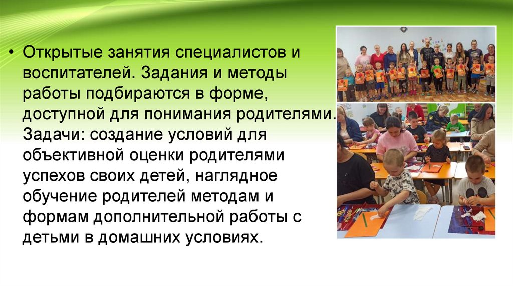 • Открытые занятия специалистов ивоспитателей. Задания и методы