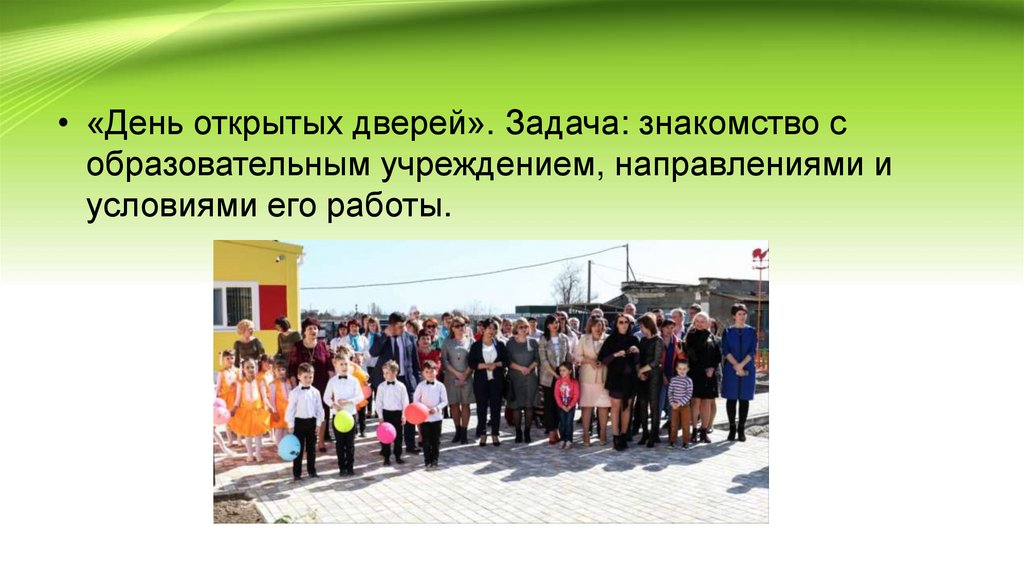 • «День открытых дверей». Задача: знакомство собразовательным учреждением, направлениями и