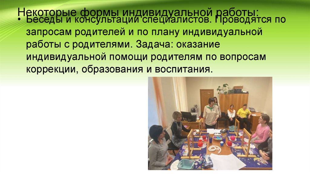 Некоторые формы индивидуальной работы:• Беседы и консультации специалистов. Проводятся по