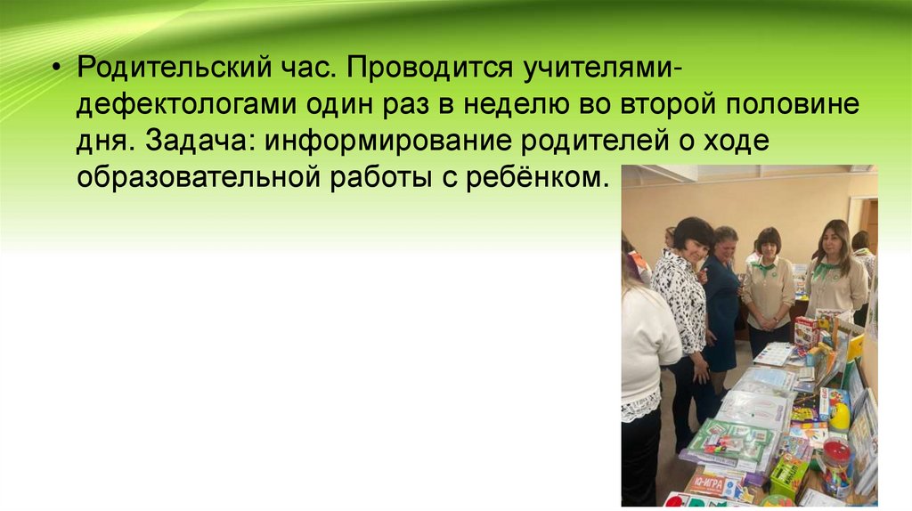 • Родительский час. Проводится учителямидефектологами один раз в неделю во второй половинедня. Задача: информирование родителей о ходе