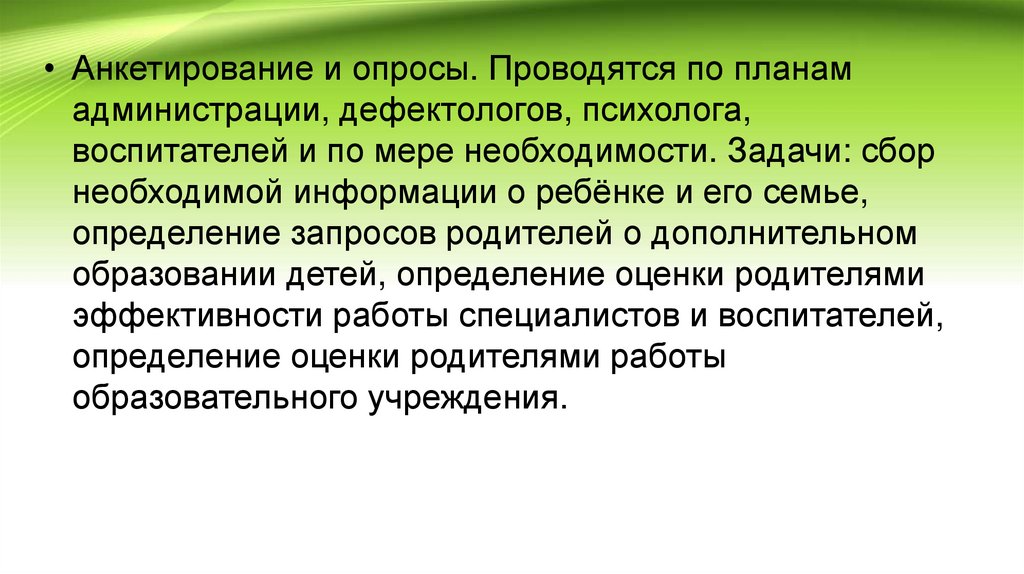 • Анкетирование и опросы. Проводятся по планамадминистрации, дефектологов, психолога,
