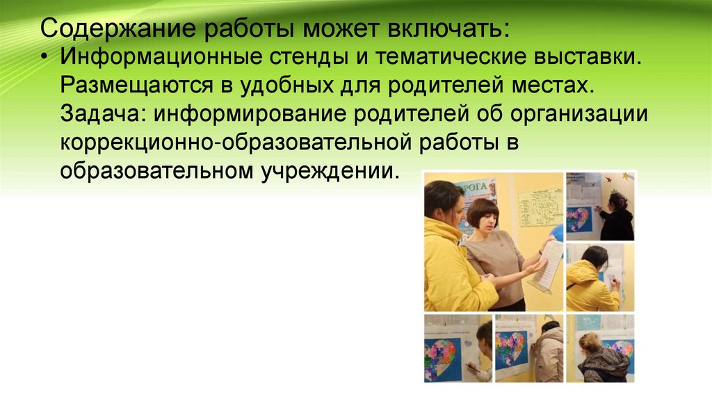 Содержание работы может включать:• Информационные стенды и тематические выставки.