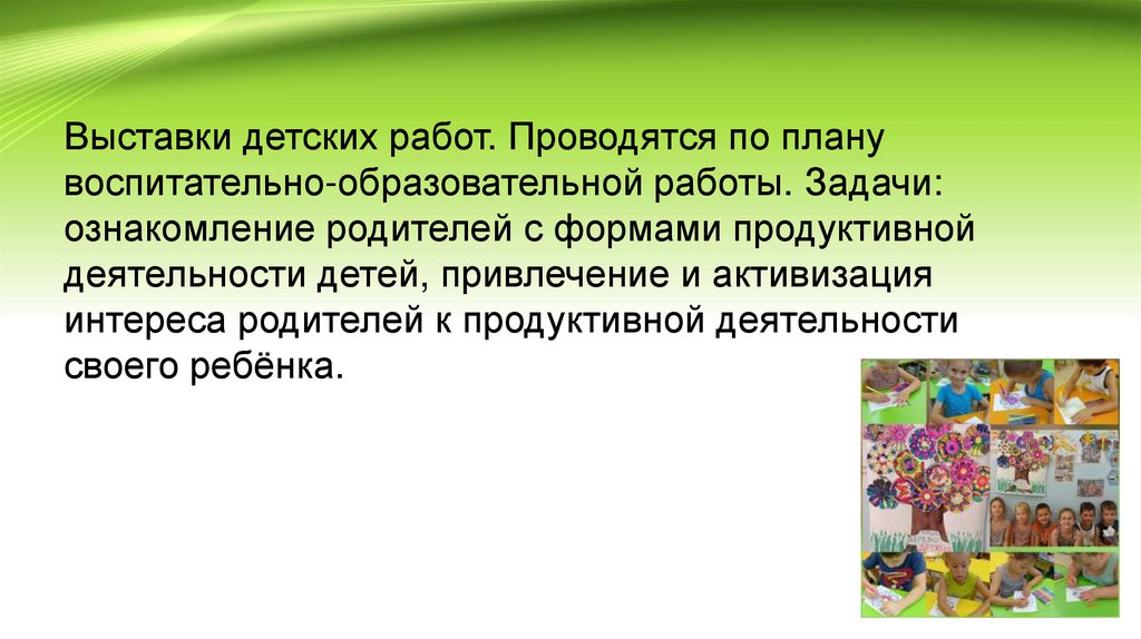 Выставки детских работ. Проводятся по планувоспитательно-образовательной работы. Задачи: