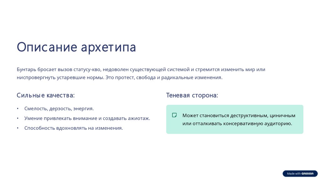 Опис ание архетипаБунтарь бросает вызов статусу-кво, недоволен существующей системой и стремится изменить мир или
