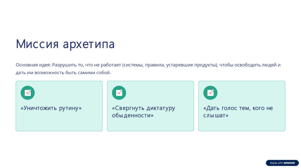 Миссия архетипаОсновная идея: Разрушить то, что не работает (системы, правила, устаревшие продукты), чтобы освободить людей и