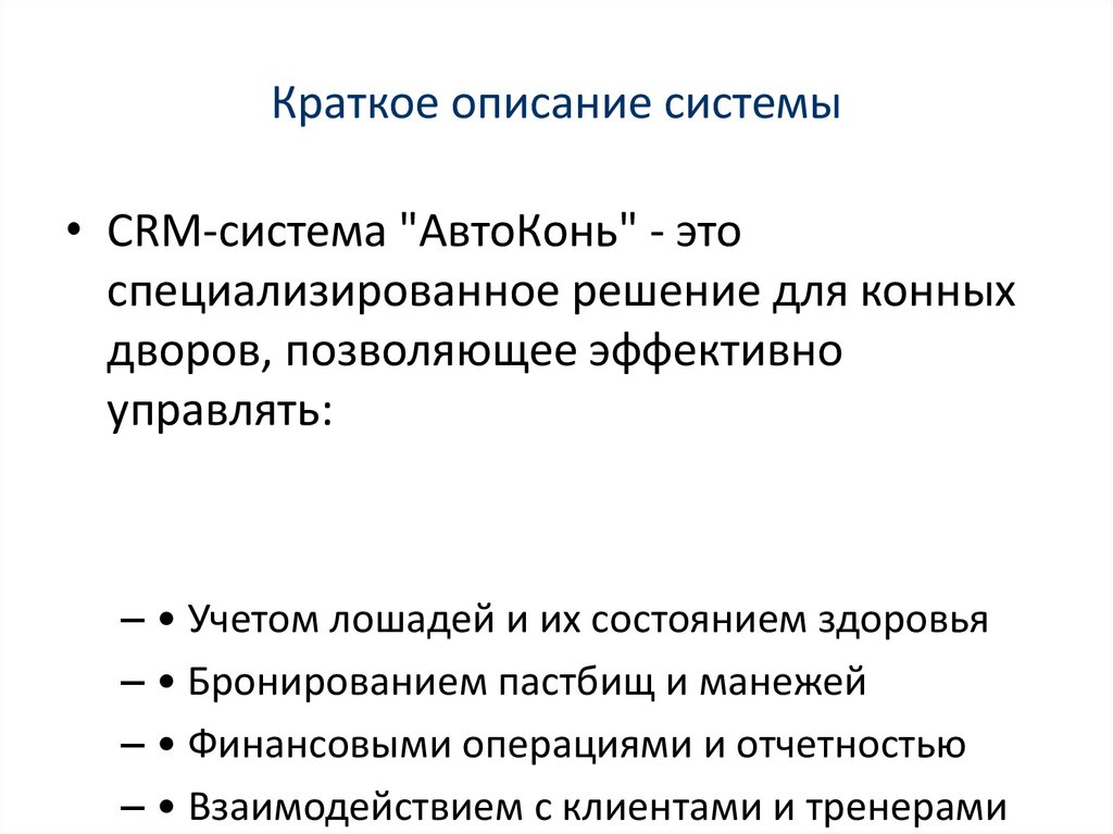 Краткое описание системы• CRM-система "АвтоКонь" - это