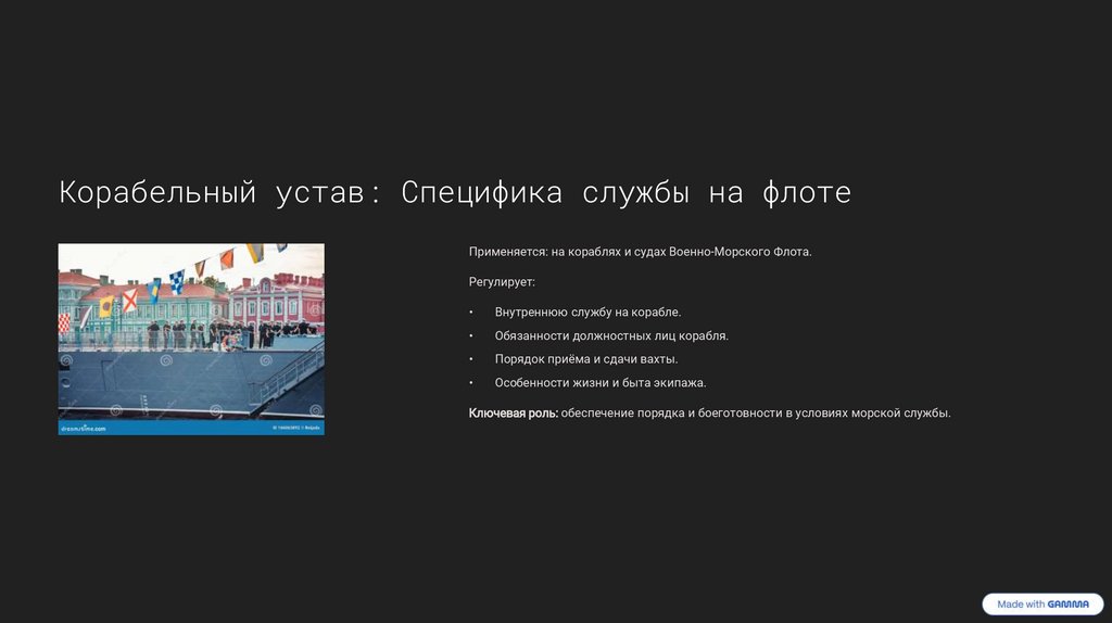 Корабельный устав: Специфика службы на флотеПрименяется: на кораблях и судах Военно-Морского Флота.