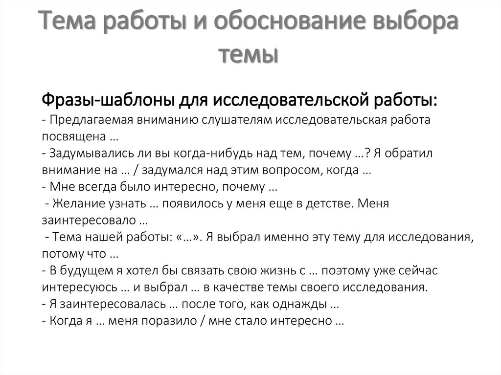 Фразы-шаблоны для исследовательской работы:- В процессе написания работы я узнал/ научился/ открыл