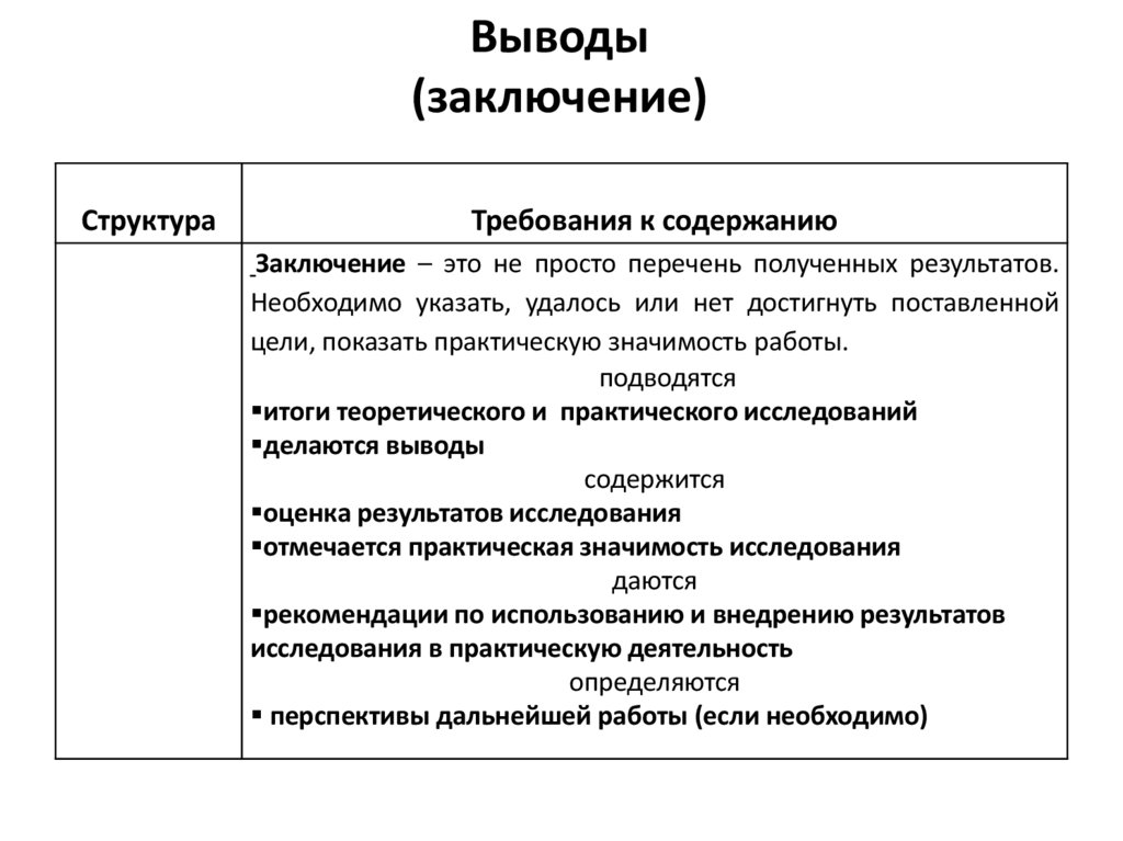 • Выводы – краткие ответы на поставленные задачи.