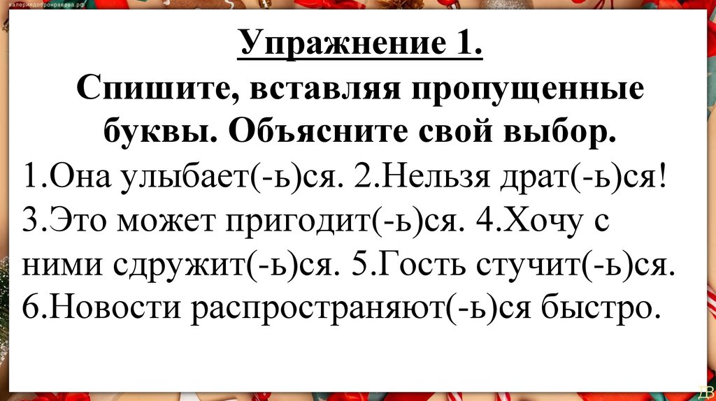 1.Она улыбает(-ь)ся. 2.Нельзя драт(-ь)ся!