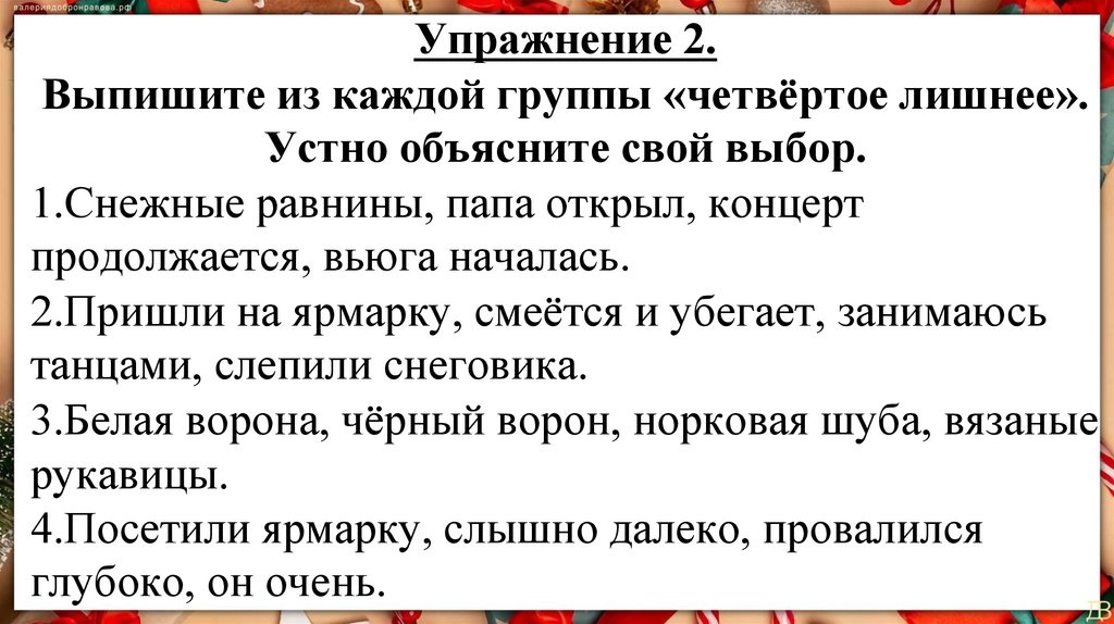 Упражнение 2.Выпишите из каждой группы «четвёртое лишнее».