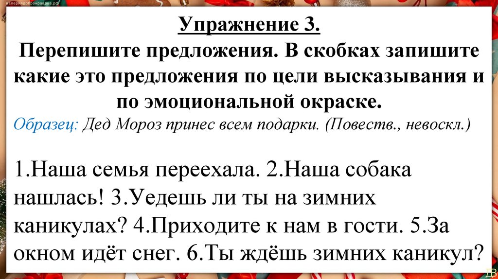 Образец: Дед Мороз принес всем подарки. (Повеств., невоскл.)