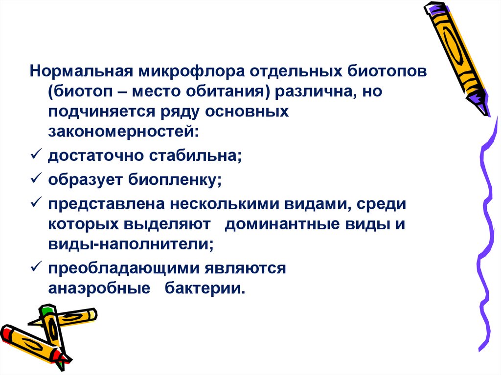 Нормальная микрофлора отдельных биотопов(биотоп – место обитания) различна, но