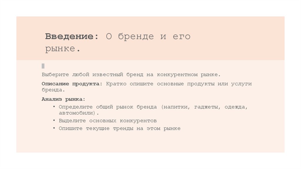 • Определите общий рынок бренда (напитки, гаджеты, одежда,