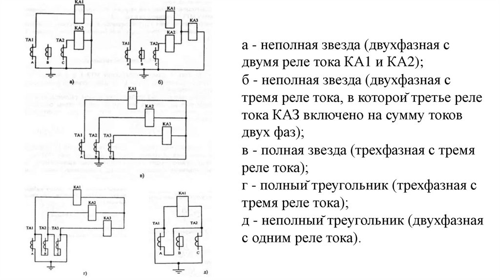 а - неполная звезда (двухфазная сдвумя реле тока КА1 и КА2);