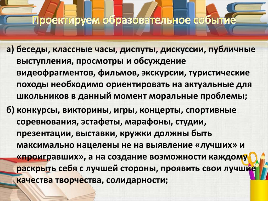 а) беседы, классные часы, диспуты, дискуссии, публичныевыступления, просмотры и обсуждение