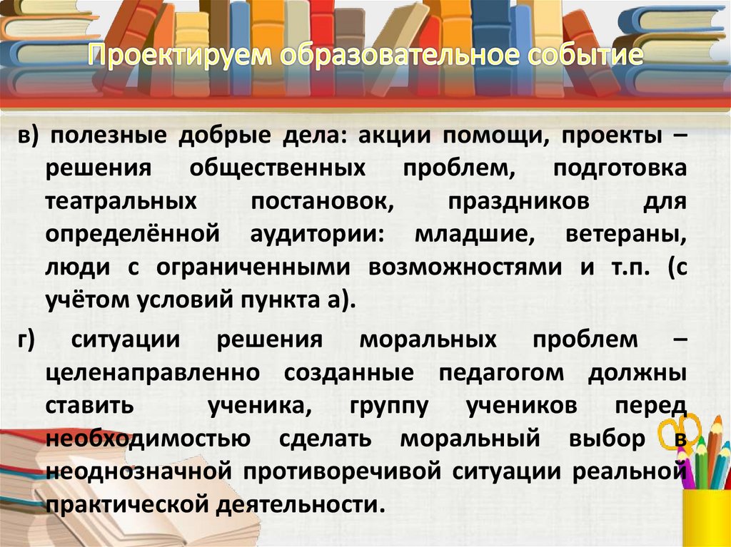 в) полезные добрые дела: акции помощи, проекты –решения общественных проблем, подготовка