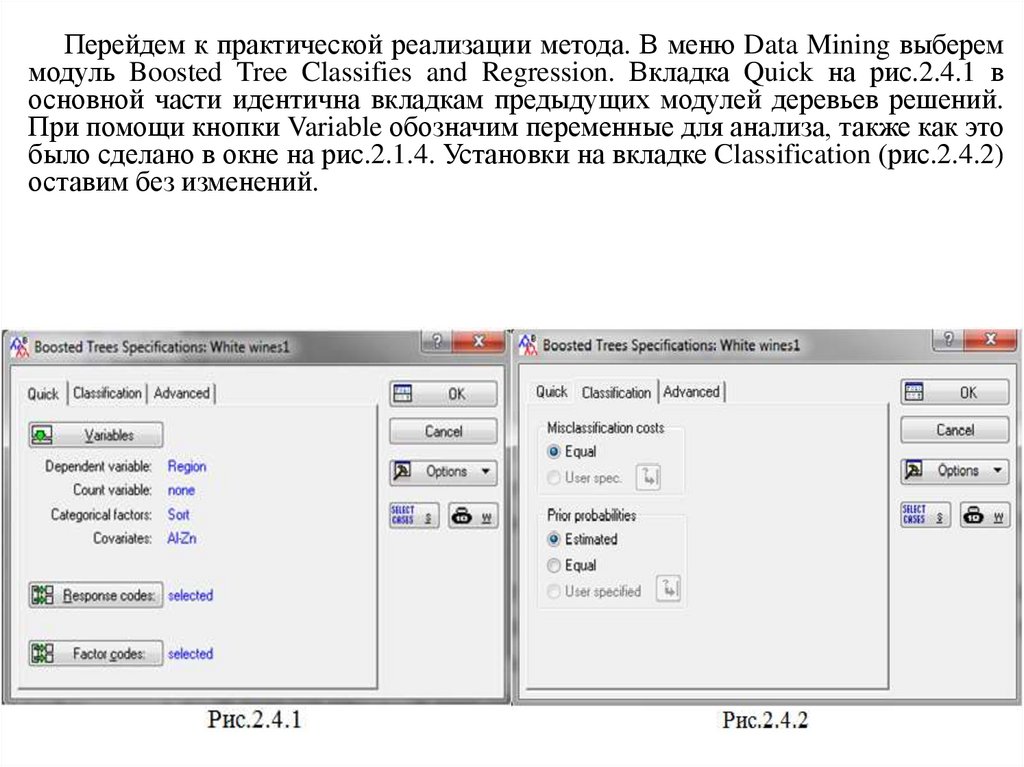 Перейдем к практической реализации метода. В меню Data Mining выбереммодуль Boosted Tree Classifies and Regression. Вкладка Quick на рис.2.4.1 в