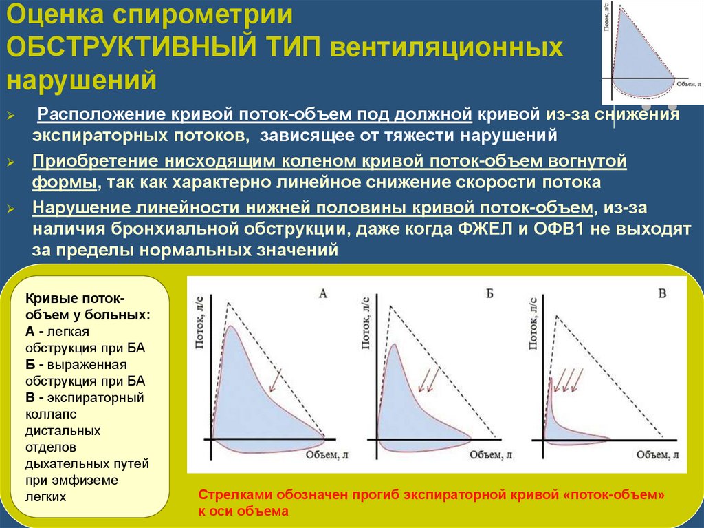 Типичные кривые «объем-время»и «поток-объем» при обратимой бронхиальной