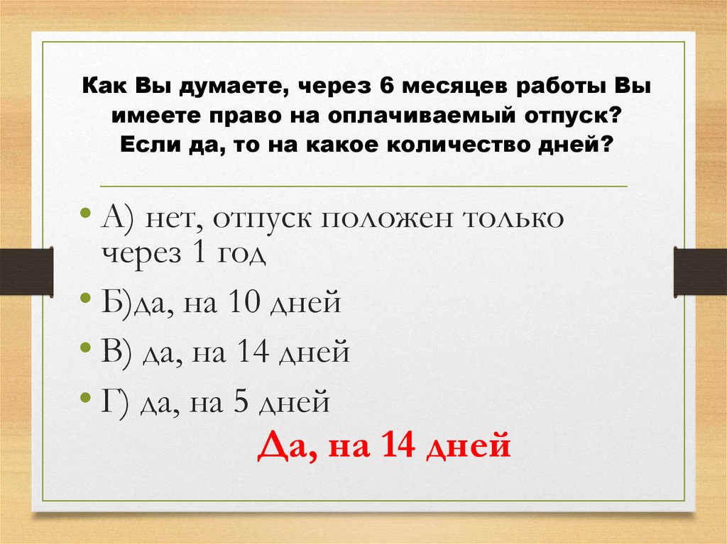 Как Вы думаете, через 6 месяцев работы Выимеете право на оплачиваемый отпуск?