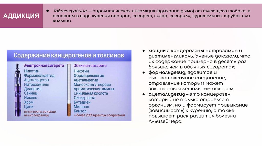 АДДИКЦИЯ● Табакокуре́ние — пиролитическая ингаляция (вдыхание дыма) от тлеющего табака, в