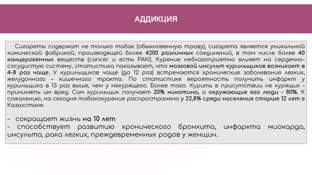 АДДИКЦИЯСигареты содержат не только табак (обыкновенную траву), сигарета является уникальной
