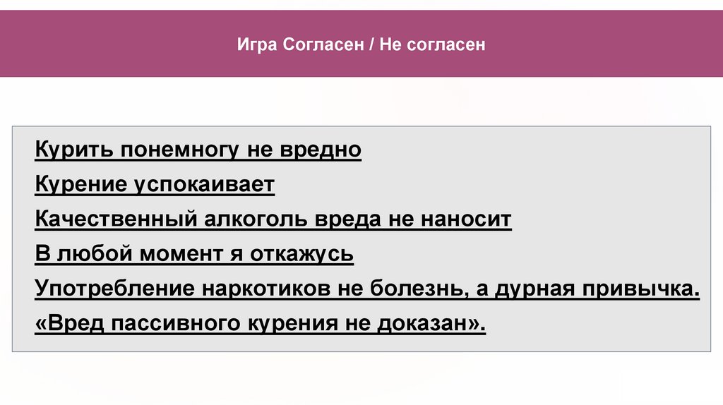 Игра Согласен / Не согласенКурить понемногу не вредно