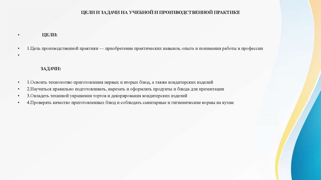 ЦЕЛИ И ЗАДАЧИ НА УЧЕБНОЙ И ПРОИЗВОДСТВЕННОЙ ПРАКТИКЕЦЕЛИ: