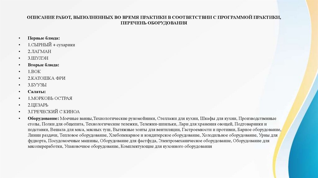 ОПИСАНИЕ РАБОТ, ВЫПОЛНЕННЫХ ВО ВРЕМЯ ПРАКТИКИ В СООТВЕТСТВИИ С ПРОГРАММОЙ ПРАКТИКИ,ПЕРЕЧЕНЬ ОБОРУДОВАНИЯ