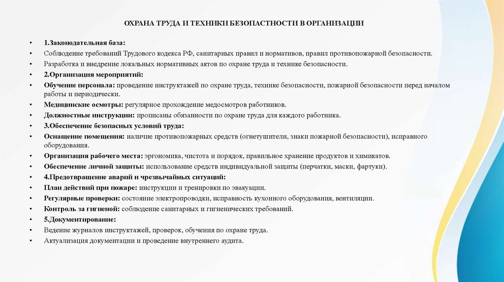 Соблюдение требований Трудового кодекса РФ, санитарных правил и нормативов, правил противопожарной безопасности.