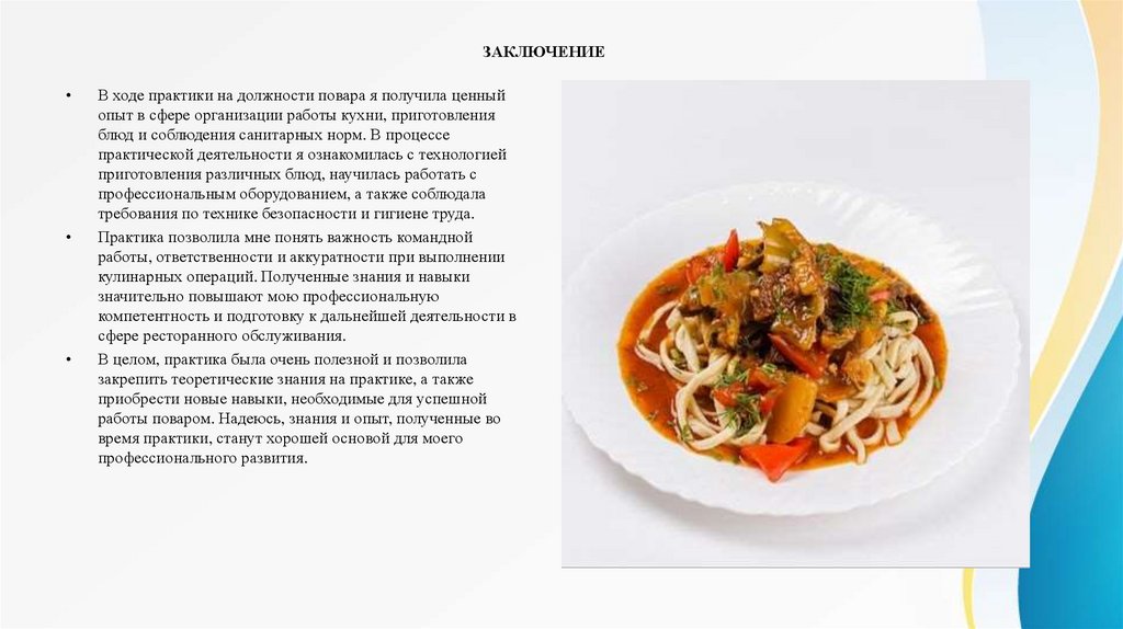 ЗАКЛЮЧЕНИЕВ ходе практики на должности повара я получила ценный