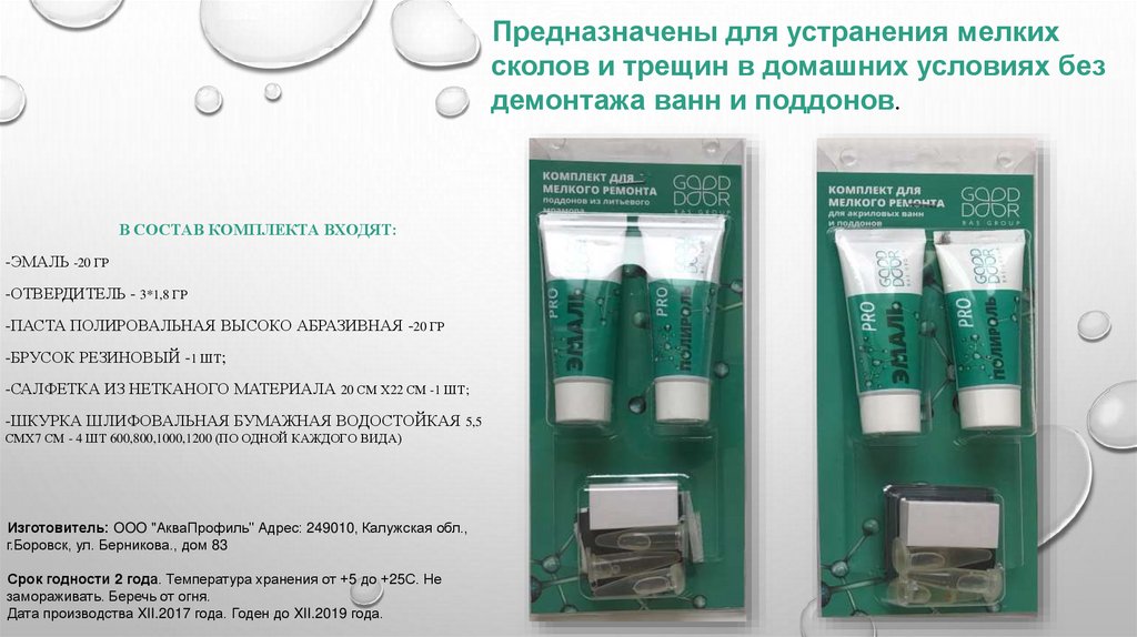 Предназначены для устранения мелкихсколов и трещин в домашних условиях без