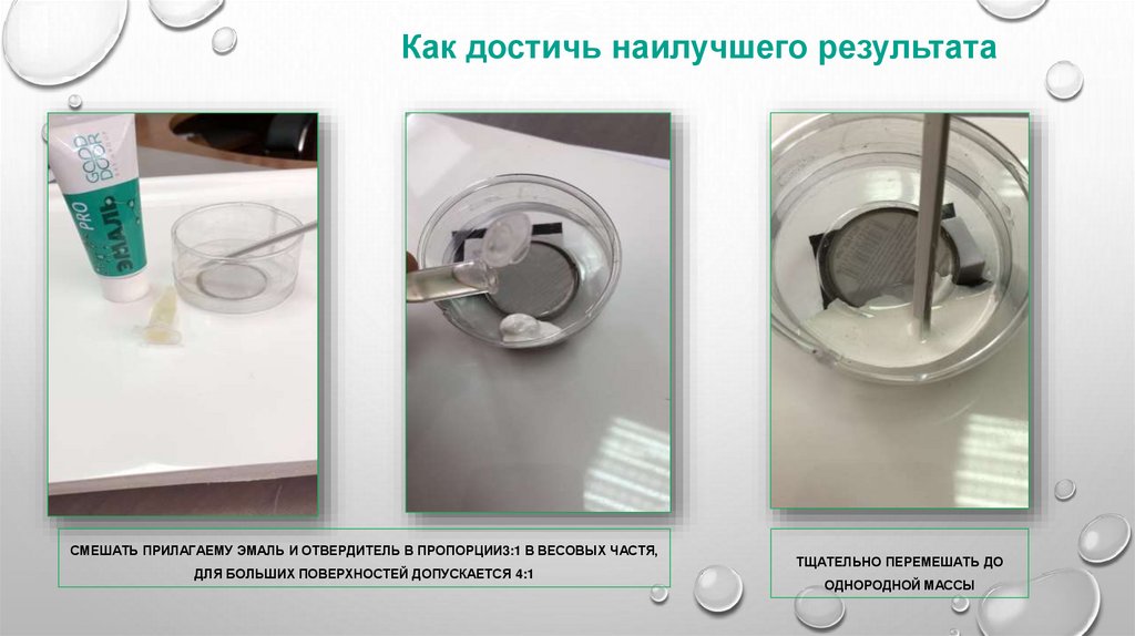 Как достичь наилучшего результатаСМЕШАТЬ ПРИЛАГАЕМУ ЭМАЛЬ И ОТВЕРДИТЕЛЬ В ПРОПОРЦИИ3:1 В ВЕСОВЫХ ЧАСТЯ,