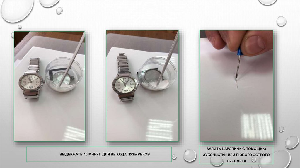 ЗАЛИТЬ ЦАРАПИНУ С ПОМОЩЬЮВЫДЕРЖАТЬ 10 МИНУТ, ДЛЯ ВЫХОДА ПУЗЫРЬКОВ