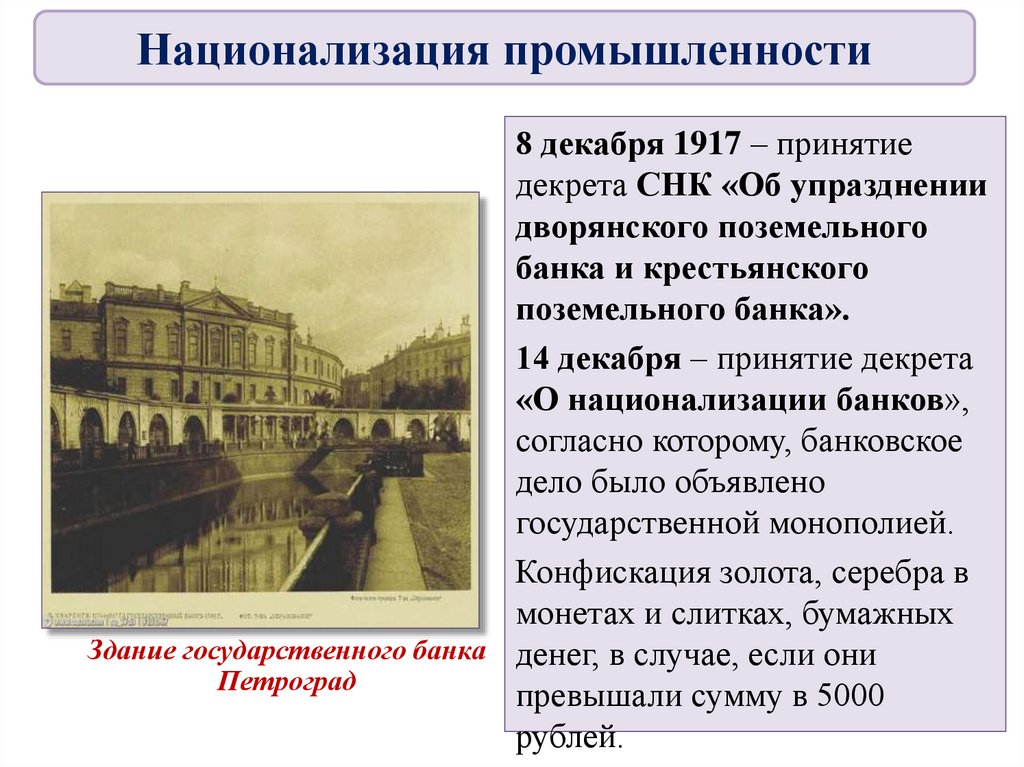 С ноября 1917 г. – национализация