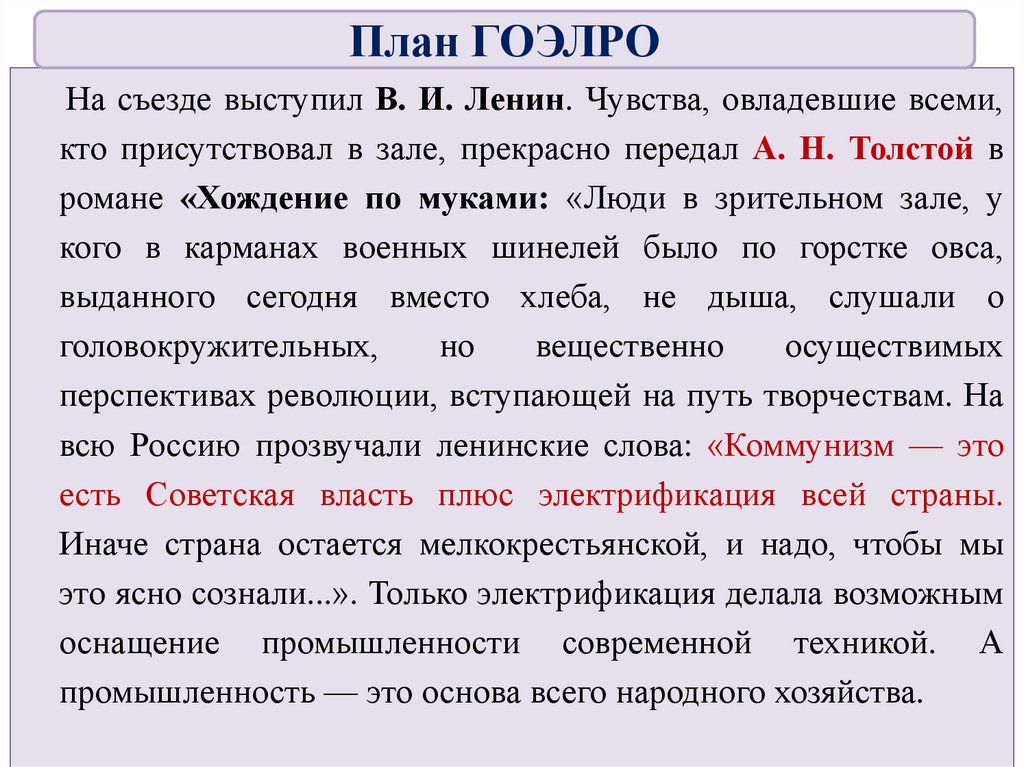 План ГОЭЛРОНа съезде выступил В. И. Ленин. Чувства, овладевшие всеми,