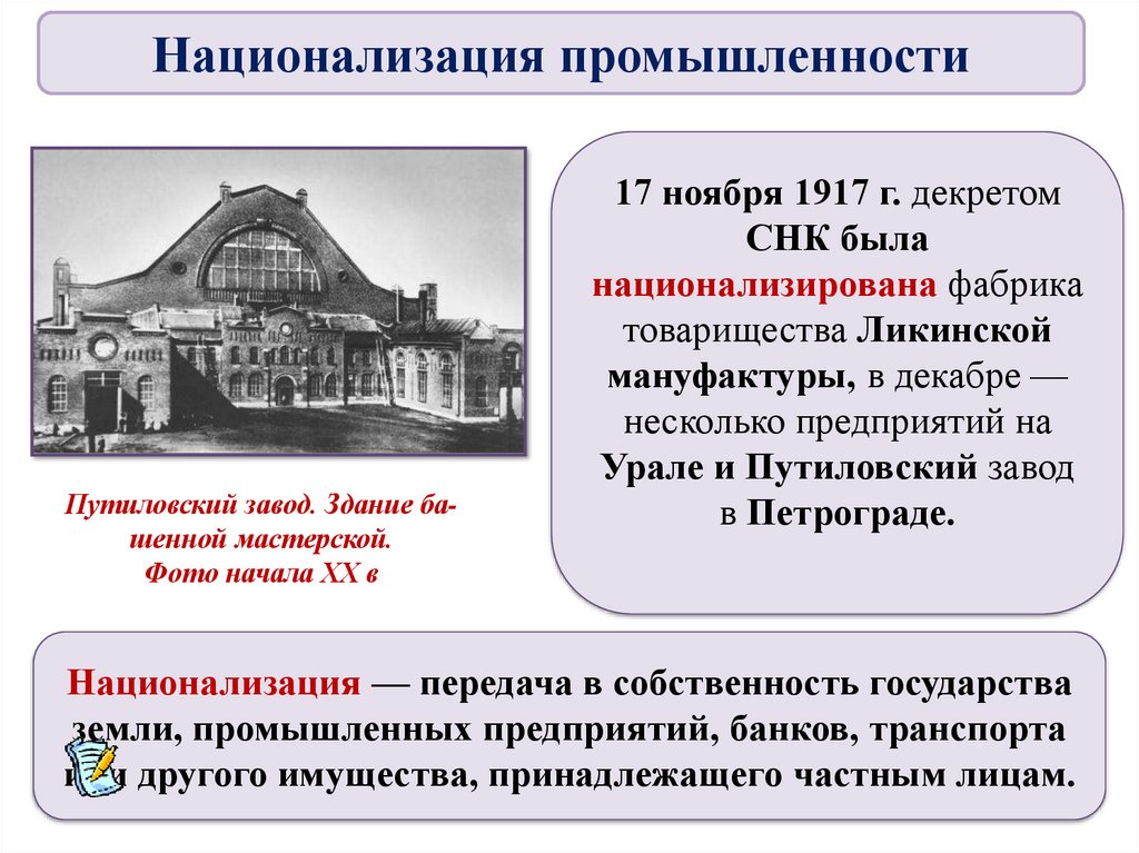 Национализация промышленностиПутиловский завод. Здание башенной мастерской.