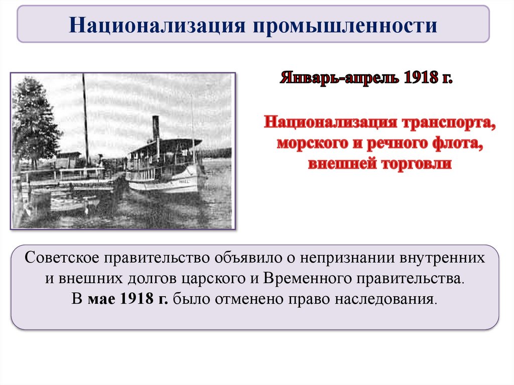 Национализация промышленностиСоветское правительство объявило о непризнании внутренних